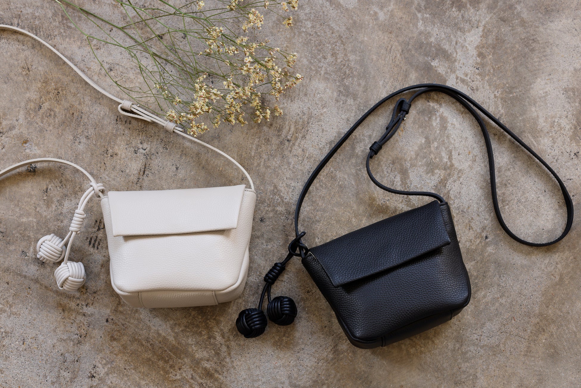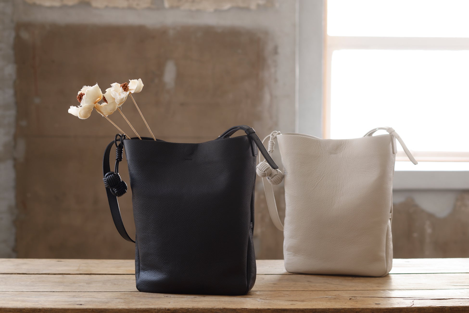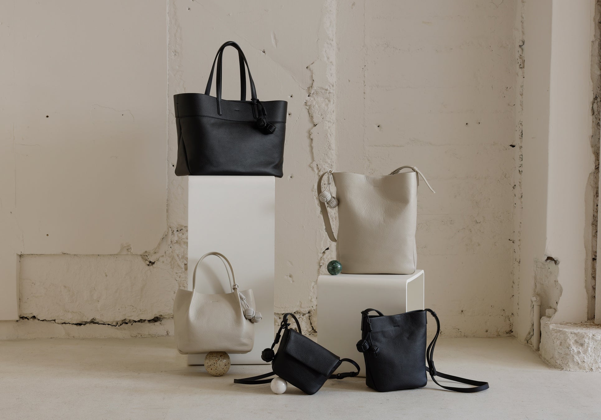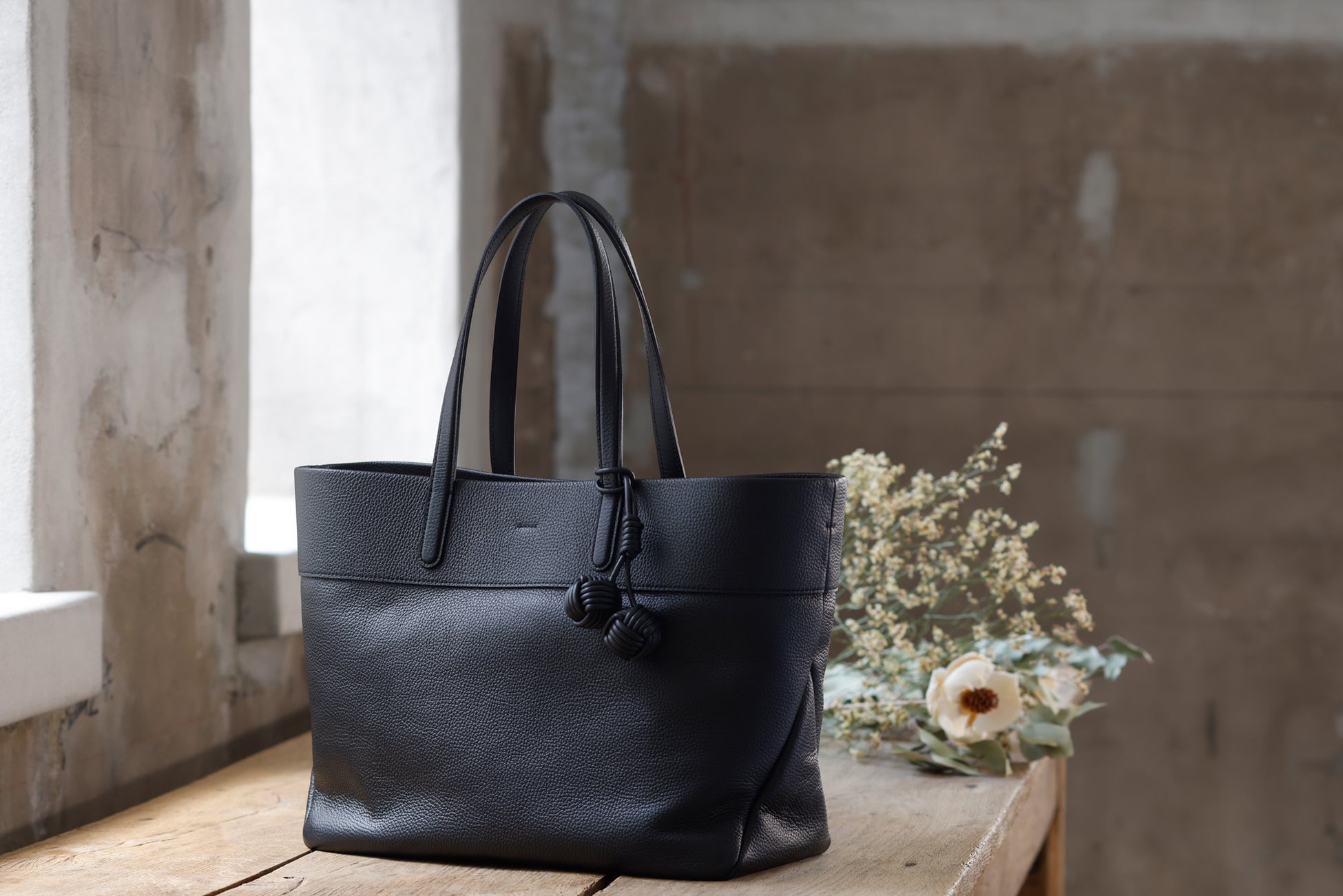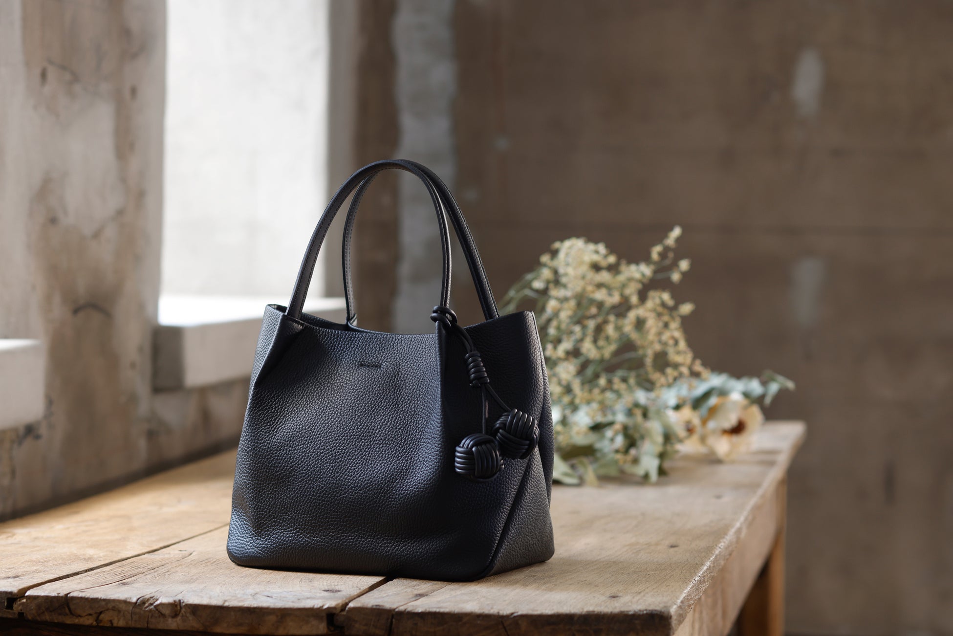 バッグの本体には丁寧になめされたイタリア製シュリンクレザーを使用し、シボによる奥行きのある表情と、手に吸い付くような質感を追求しました。革の自然なハリと厚みを生かしながら、立体感のあるフォルムへと仕立てています。バッグの細部には、手縫いや加工を施し、機械では表現できない手仕事のディテールを盛り込みました。すべてのバッグには、ブランド名に込められた“点と点”をイメージした“玉”をモチーフにしたチャームが付属します。