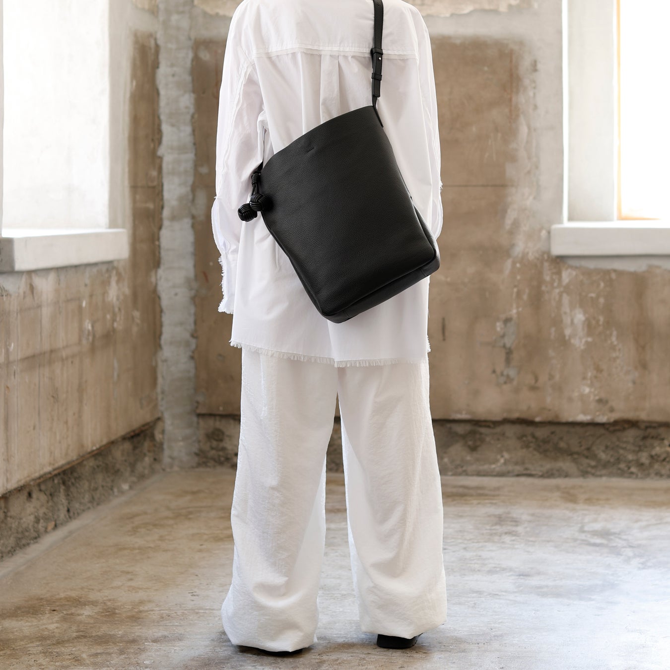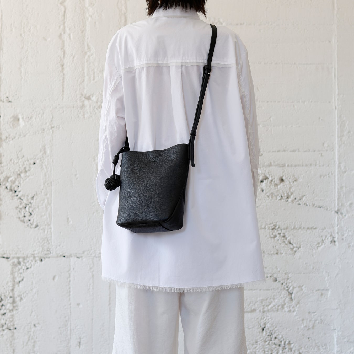 縦型のすっきりとしたシルエットが美しい、ミニマルデザインのバケット型ショルダーバッグ