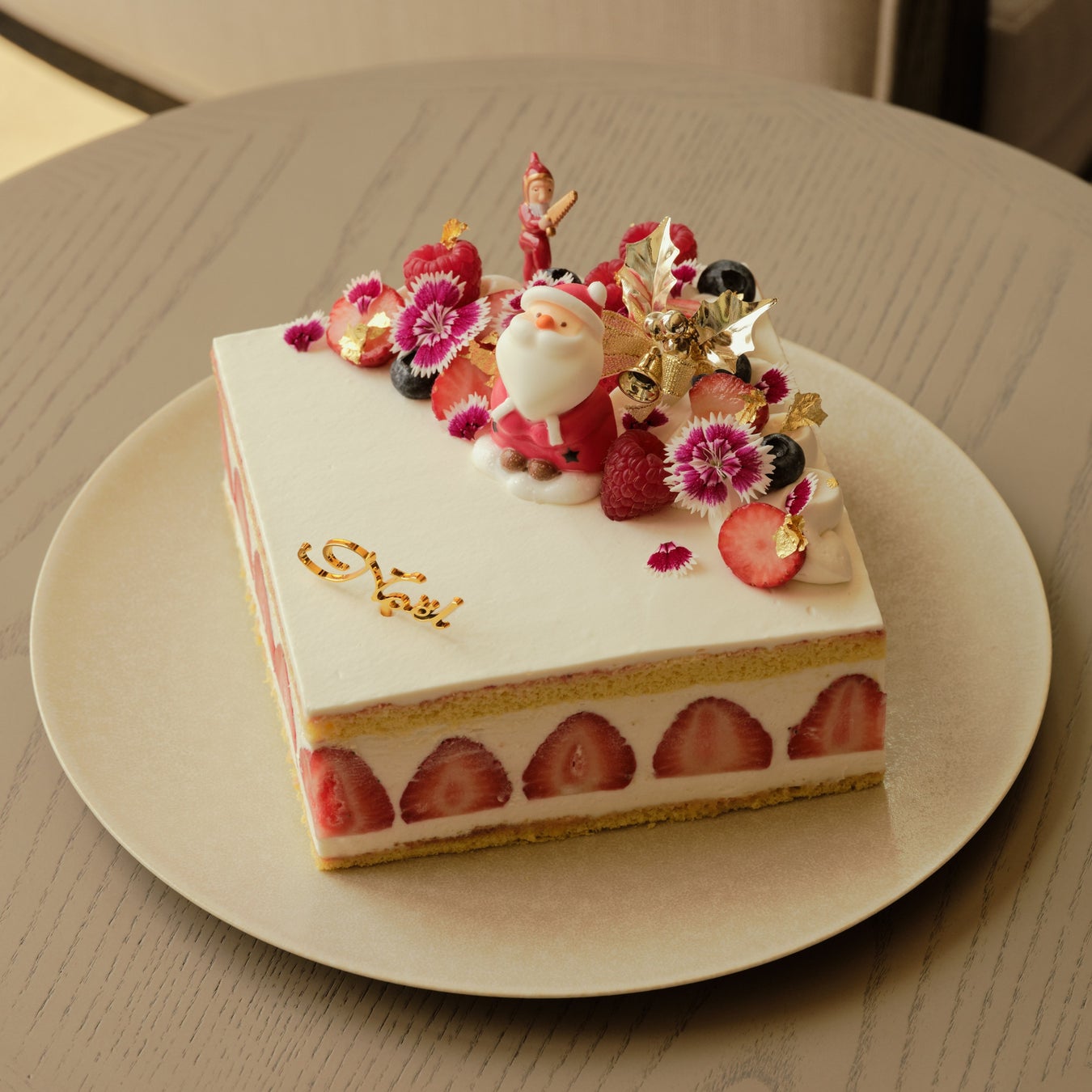 縦にカットした苺が断面に美しく並ぶ姿は、思わず笑みを誘います。シャンティクリームとスポンジには国産のきび砂糖を用い、優しく奥行きのある甘さに仕上げました。トップには苺のほか、ラズベリーやブルーベリーを彩り豊かに飾り、愛らしいシュガーサンタがケーキを見守るように腰掛けています。素材が織りなす調和のとれた味わいは、テーブルに温もりと歓びをもたらし、大切な家族や仲間とのつながりをいっそう深めてくれるでしょう。