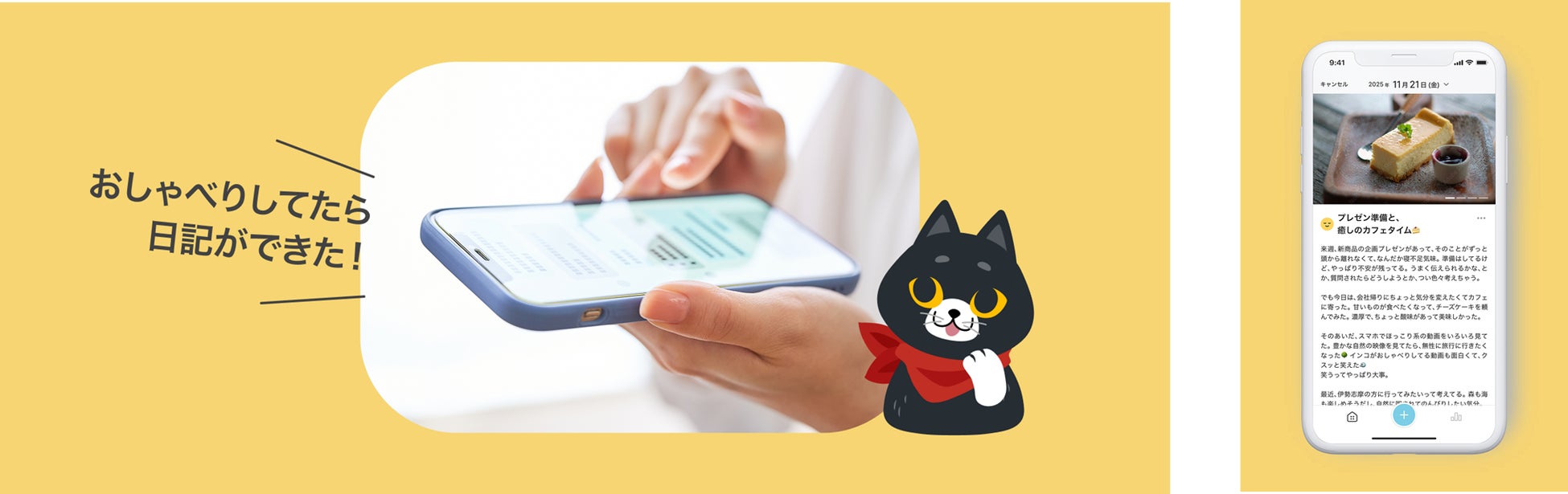「Yell-U」は、“文章を書く”のではなく“AIと会話する”だけで日記が完成する、新しいスタイルのアプリです。会話を通して一日の出来事や気持ちを振り返ることができるため、自然に習慣化でき、楽しみながら継続することができます。