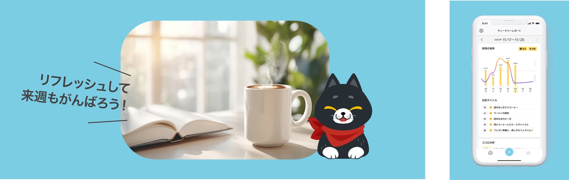 一週間の気持ちの変化や行動をAIが分析。さらに、自分に合ったリフレッシュ方法を提案してくれるため、生活改善にも役立ちます。