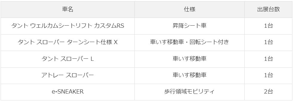 今回のH.C.R.2025では、車いす移動車や昇降シート車の福祉車両4台と、2025年8月に発売を開始した近距離移動をサポートする歩行領域モビリティ「e-SNEAKER」を出展します。