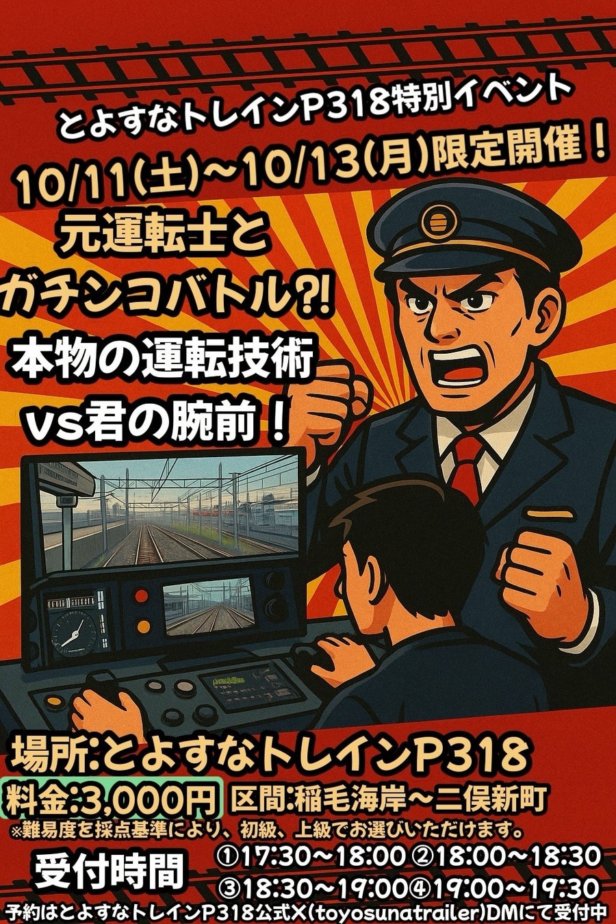 JR東日本トレインシミュレータを用いて、元運転士と運転技術を競うイベントを開催いたします。料金はおひとりさま3,000円です。現在、とよすなトレイン P318公式X(@toyosunatrailer)のDMでご予約受付中です。以下の枠からお申し込みください。