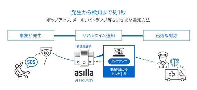 アジラは、独自開発の「行動認識AI」を基盤とし、映像上の人物の姿勢や動作をリアルタイムで解析することで、転倒・暴力・侵入・放置物などの異常行動を即時検知・通知するAI警備システム「AI Security asilla」を提供しています。この技術は、警備業界が抱える人手不足や高齢化、また、それらの課題解決に伴うコスト増といった問題に対する有効な解決策として注目されており、国内外の複合施設・駅・ホテル・病院・空港など150施設以上に導入実績があります。