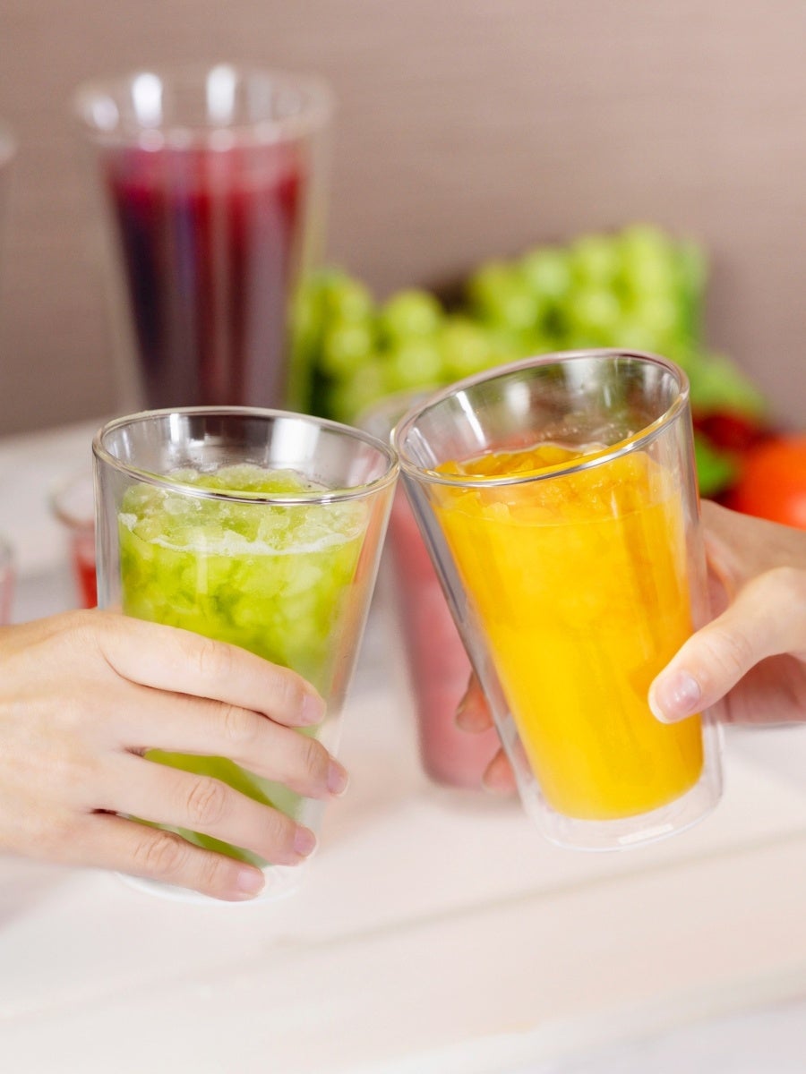 アサイードリンクと巨峰果汁入りのフレーバー氷を使用した【紫】や、オレンジジュースとマンゴー果汁入りのフレーバー氷を使用した【黄色】など、見た目の鮮やかさだけでなく、味わいにもこだわったリッチなお飲み物です。