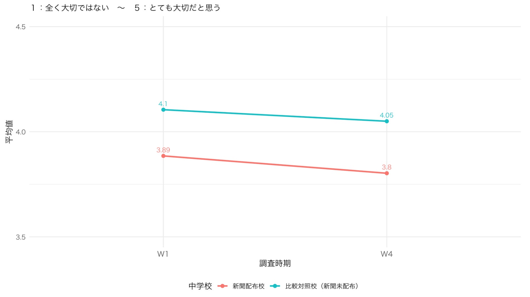 新聞配布校とは別に、配布しない学校でも調査を行ったのは、中学1年という多感な時期に、新聞に触れなくても生徒の意識の変化が起きる可能性はあり、「対照群」を作らないと、新聞閲読の効果をきちんと測定できないためです。