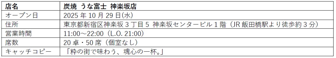 名古屋発祥のうなぎの名店『炭焼 うな富士』(運営:株式会社かぶらやグループ/代表取締役社⾧:榎本 渉)は、東京・神楽坂に関東では3店舗目となる新たな店舗をオープンいたします。企業ミッションである「幸腹の刻をともに。」を胸に、名古屋で育んできた味とおもてなしを、粋な街・神楽坂の空気と融合させ、より多くのお客様にうな富士のお料理を届けたい、という想いから誕生する新店です。