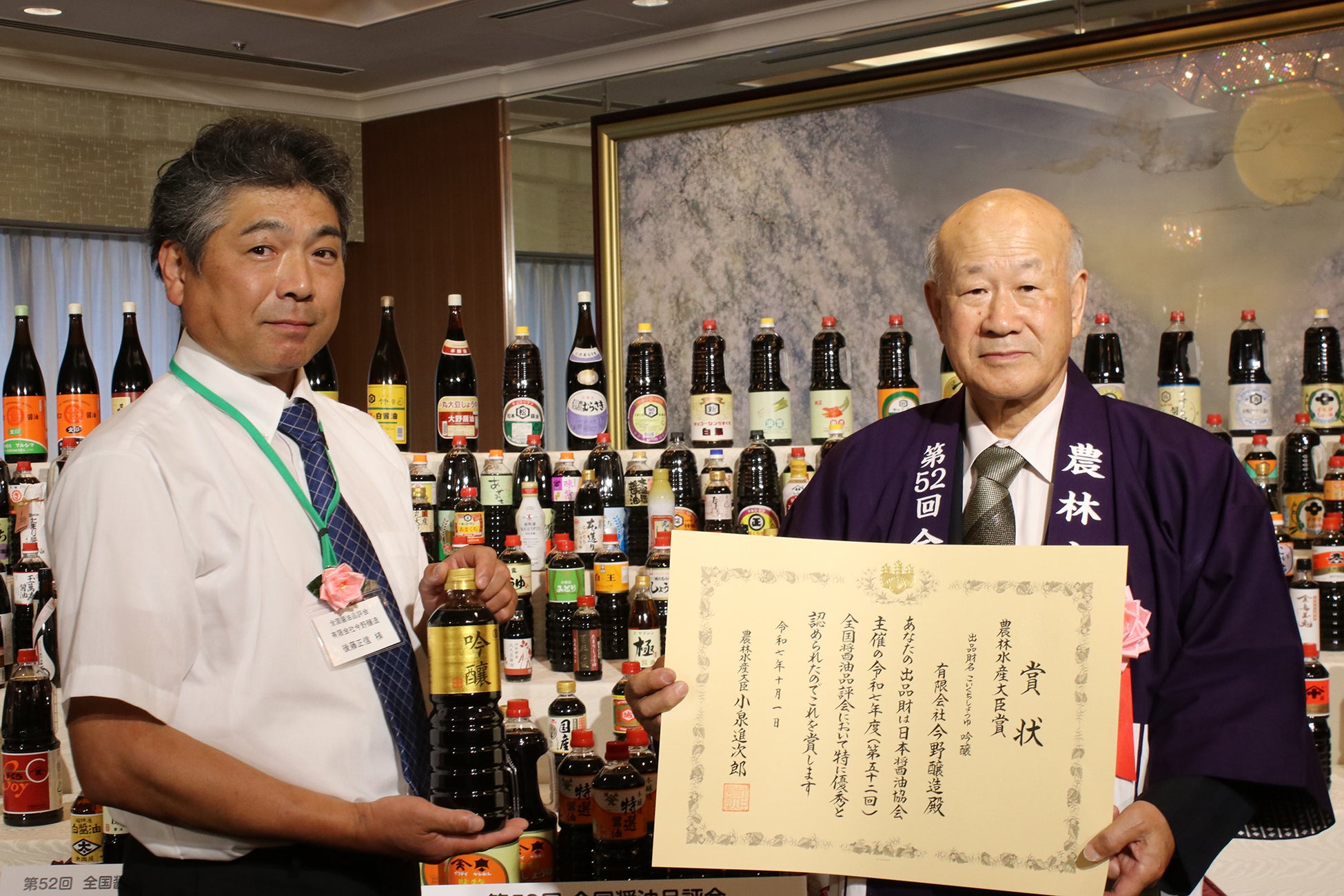 宮城県加美町の有限会社今野醸造(代表取締役:今野 昭夫)の「吟醸醤油」が、 令和7年10月1日、東京・ロイヤルパークホテル(水天宮前)で行われた「醤油の日の集い」にて、 第52 回全国醤油品評会の最高賞・農林水産大臣賞を受賞しました(主催:日本醤油協会/後援:農林水産省)。