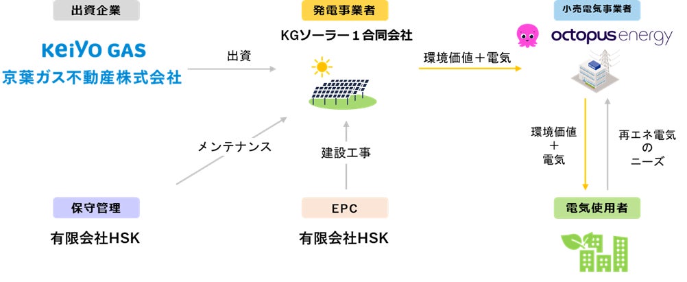 これらの発電所で創出された電力および環境価値は、TGオクトパスエナジー株式会社を通じて電気の使用者に供給されます。また、太陽光発電所の開発・建設・メンテナンスは、有限会社HSKが担っております。