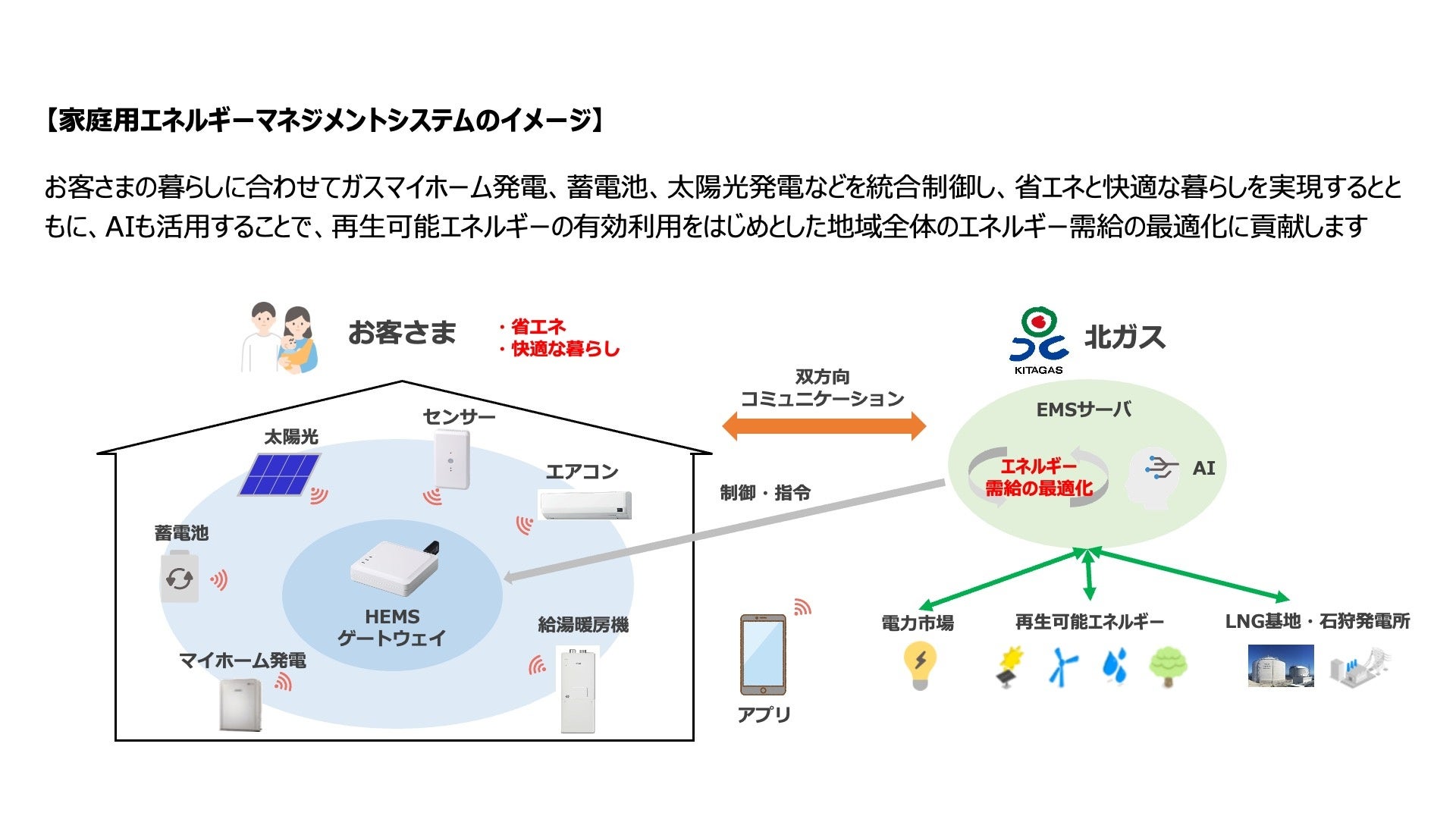 これにより、お客さまの暮らしに合わせてガスマイホーム発電、蓄電池、太陽光発電などを統合制御し省エネと快適な暮らしを実現するとともに、AIも活用することで、再生可能エネルギーの有効利用をはじめとした地域全体のエネルギー需給の最適化に貢献いたします。