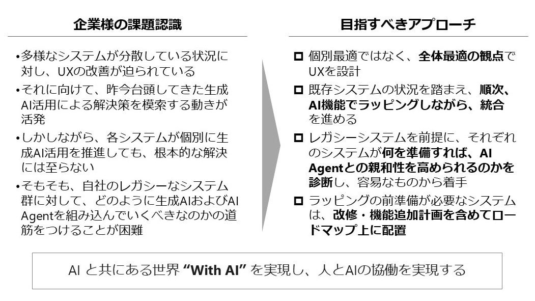 こうした状況から現在求められているのは、システム単位の「個別最適」ではなく、「全体最適」の観点でUXを再設計し、既存システムをAIによって包括的にラッピングするアプローチです。