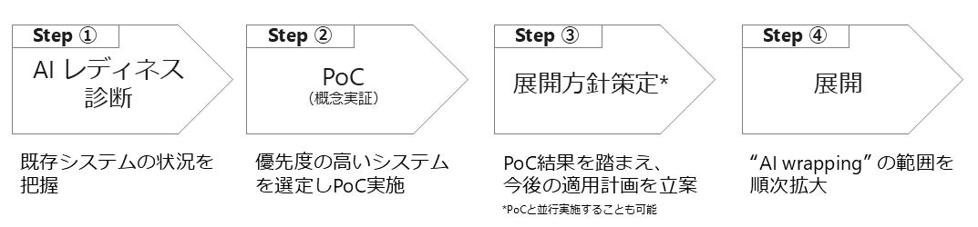 初期段階では1つのシステムを対象に絞ってPoC(概念実証)を実施。その結果を踏まえて段階的に対象を拡張し、スムーズなAI導入を支援します。また、初期PoCにおいて、AI wrappingの導入ハードルが低く、利益実感の大きなシステムを対象にすることで、次のステップへの弾みを付けます。 -