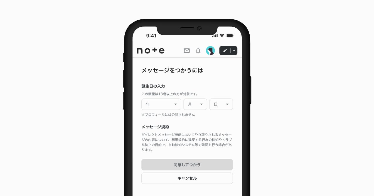 メッセージ機能の利用開始時に、生年月日を確認します。 13歳以上のみが利用可能です。