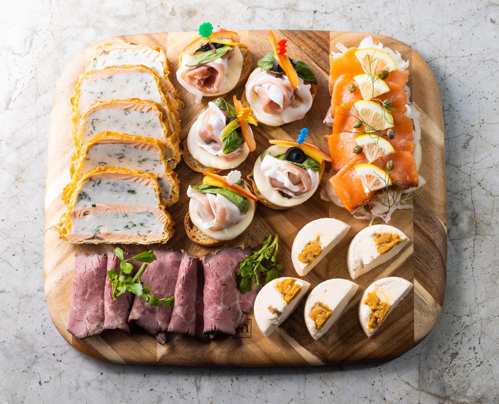 <内容>上段:うにのムース/海鮮ラビゴットソース和え/パテ・ド・カンパーニュ/生ハムカプレーゼ/牛タンアスピック/サラミプレーン/モルタデラ/スモークサーモン