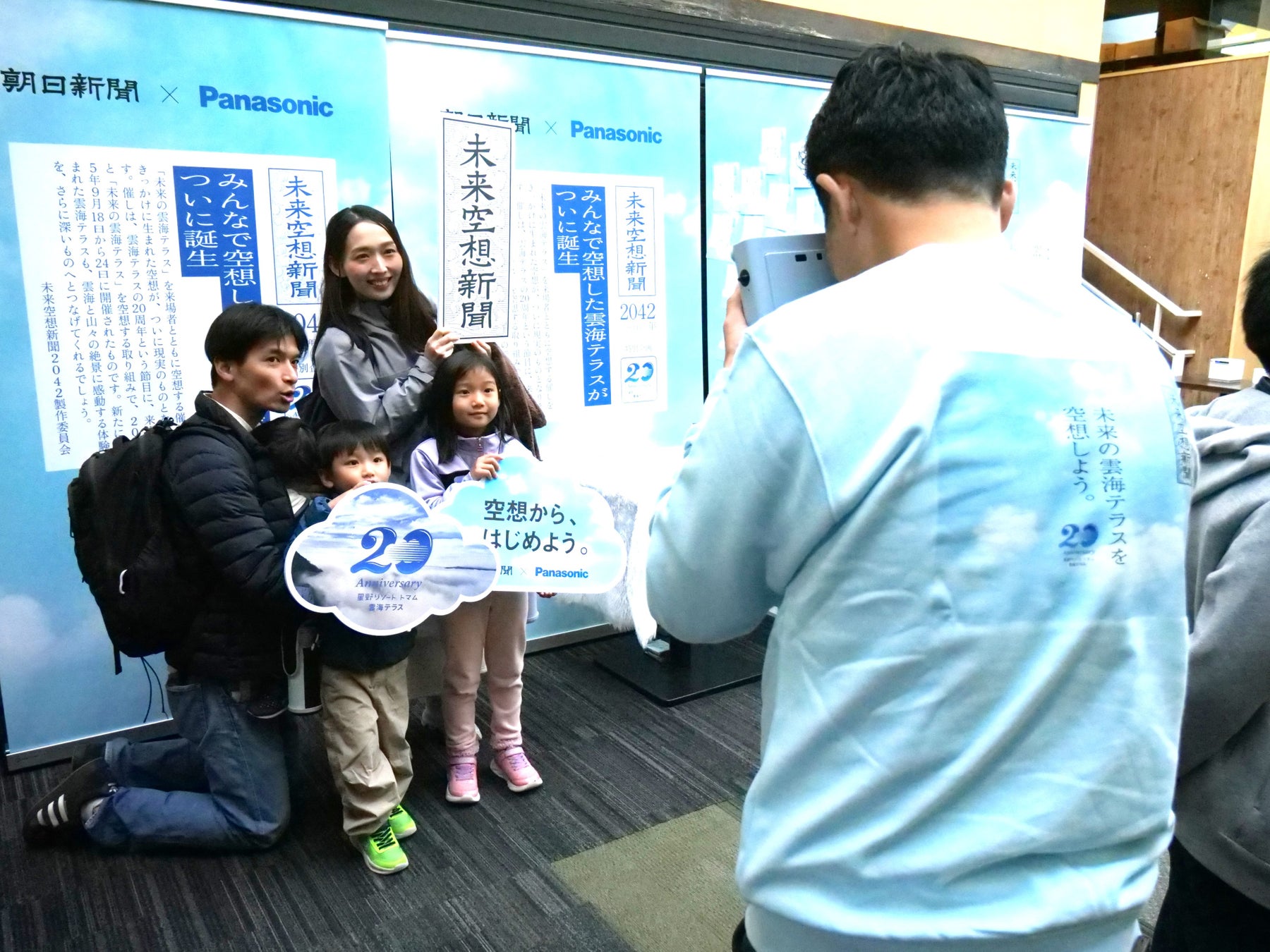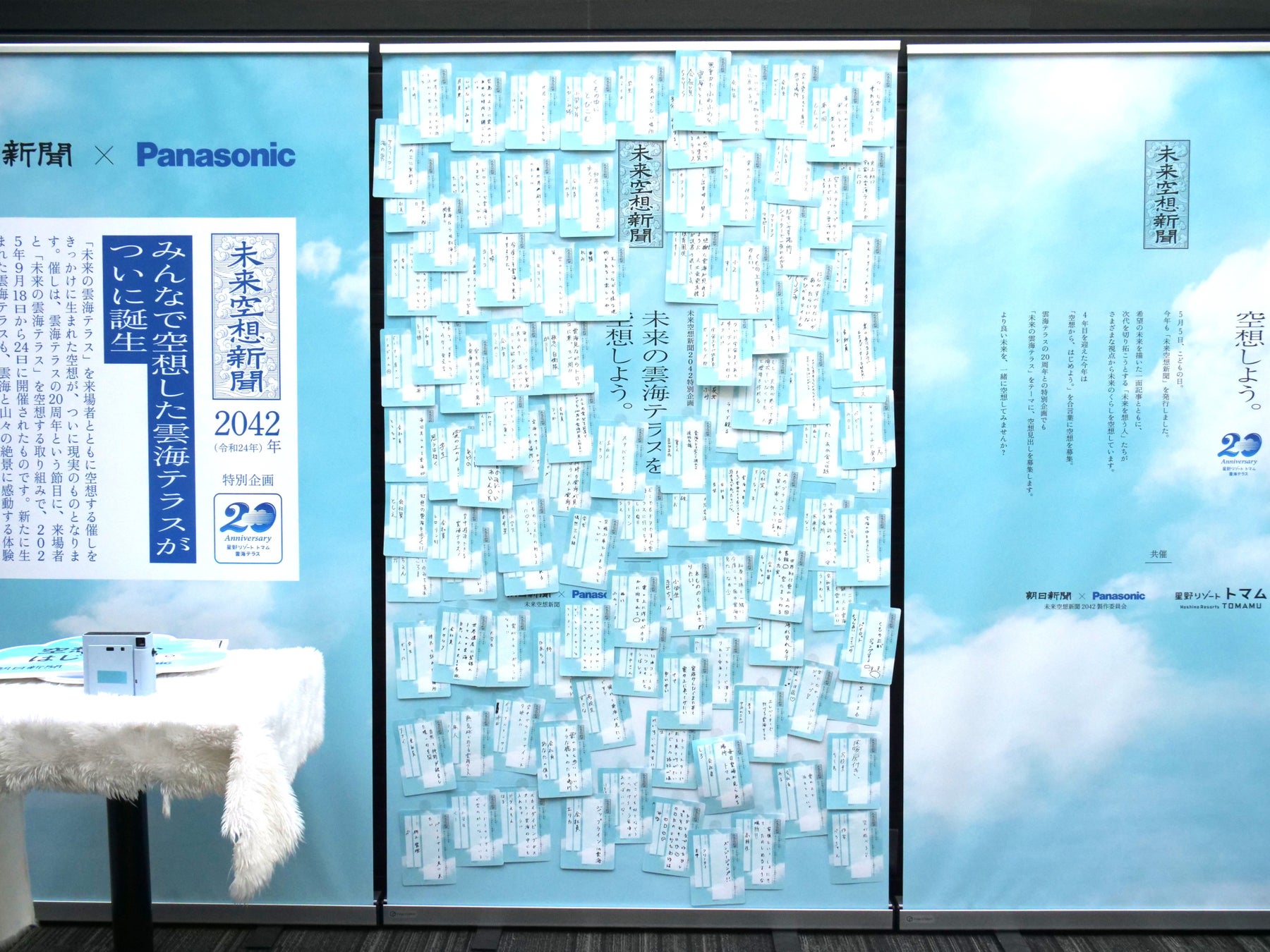 パナソニック株式会社(以下、パナソニック)と株式会社朝日新聞社(以下、朝日新聞社)の共創プロジェクトである「未来空想新聞2042製作委員会」は、2025年9月17日(水)から9月24日(水)まで、北海道の滞在型リゾート「星野リゾート トマム」と共同で、「未来空想新聞2042」特別企画 ~未来の雲海テラスを空想しよう。~ を開催しました。本企画は、未来について空想し語り合う機会を創出し、より良い未来の実現に貢献する「未来空想新聞2042」の活動の一環として、星野リゾート トマムの雲海テラス来場者に“未来の雲海テラス”を空想するユニークな体験を提供するものです。開業20周年を迎える雲海テラスが提供する壮大な空の絶景と、「空を見上げて、未来を想う。」という未来空想新聞のメッセージが共鳴し、今回のコラボレーションが実現しました。