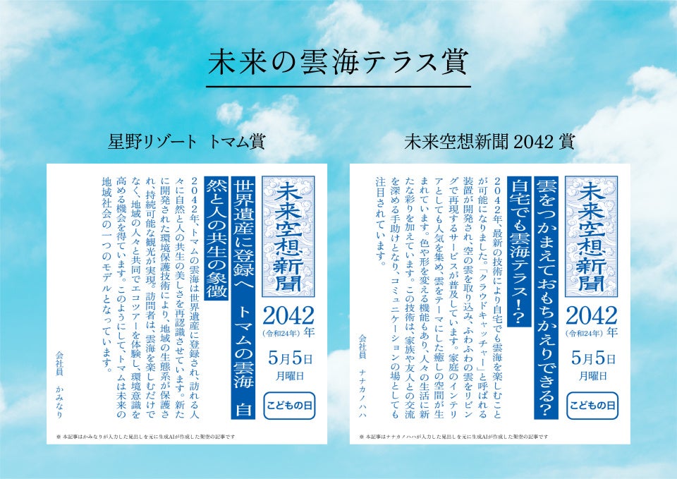 体験展示で集まった530件以上の見出しから、星野リゾート トマムのスタッフと未来空想新聞2042製作委員会が、独創性や未来への希望にあふれた見出しを「未来の雲海テラス賞」として選出。受賞作品は、星野リゾート トマム公式サイト、パナソニック公式ニュースサイトやSNSで発表しました。