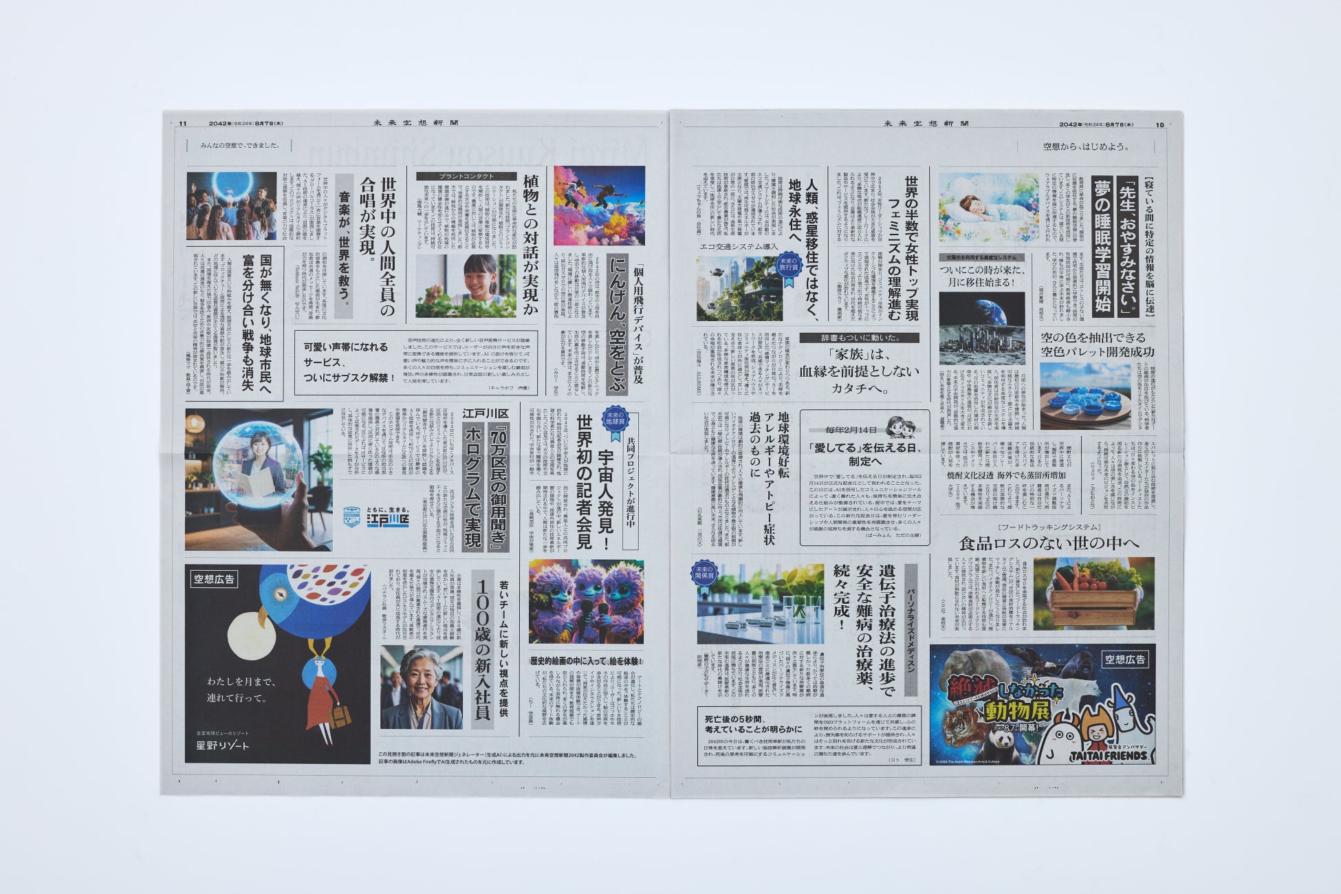 未来空想新聞は、多くの人がともに未来を空想し、より良い未来を共創するためのプラットフォームです。2022年の創刊から4年目となる「未来空想新聞2042」では、一般の方からも空想を募集し、5,300件を超える多様な未来を想う空想記事が寄せられました。その一部は、「未来空想新聞2042WEB版」や「未来空想新聞2042」第二弾で紹介されています。また、「未来空想新聞2042」第二弾には、コンセプトに賛同いただいた企業・自治体による空想広告や空想記事を掲載しており、星野リゾートによる空想広告の展開をきっかけに、よりコンセプトを具現化する取り組みとして、今回の共創企画の実現につながりました。