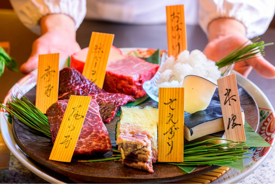 おばいけ(尾びれ)の爽やかな歯ざわり、本皮の脂の旨み、赤身の素直な味わい、霜降りの入る尾の身、ゼラチン質豊かなさえずり(舌)、そして伝統の鯨ベーコン――。それぞれの個性に寄港地の素材や多彩な出汁を合わせ、日本料理の美学「五味五色五法」や「名残・旬・走り」を大切に表現しました。
