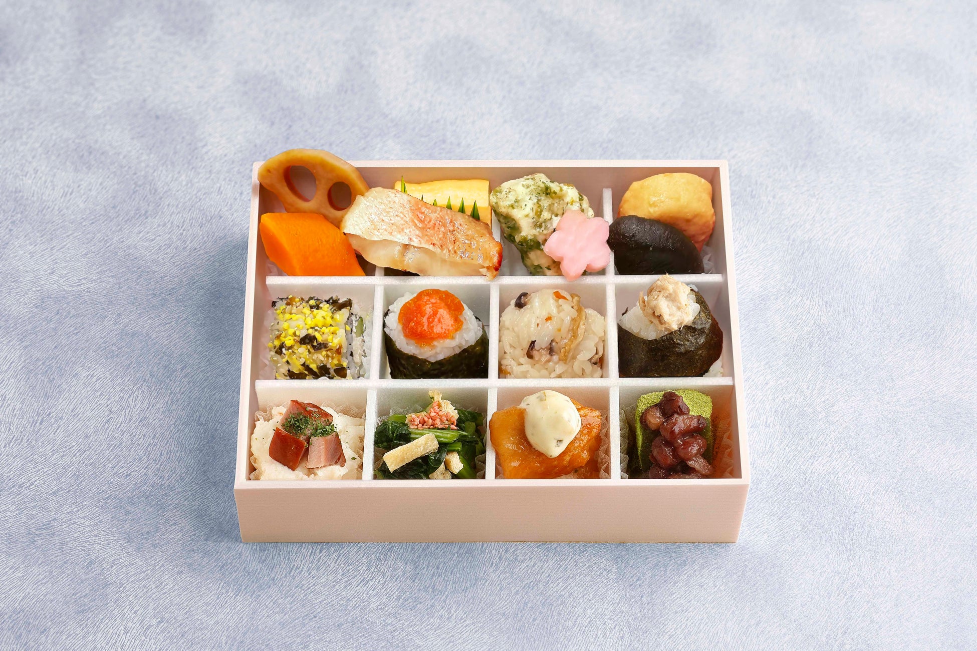 お弁当の掛け紙には、飛行機をモチーフにしたオリジナルデザインを配し、旅のワクワク感を演出しました。献立は、一口サイズで可愛らしく食べやすい4種の「手毬御飯」をはじめ、丁寧に仕上げた赤魚祐庵焼や鶏南蛮漬、なだ万ならではの出汁が際立つ小松菜煮浸しや煮物など、なだ万の味を少しずつ色々とお楽しみいただけるよう、16品目のおかずと甘味を彩り豊かに盛り込みました。小さなお子様からご年配の方まで、幅広く喜んでいただける内容です。