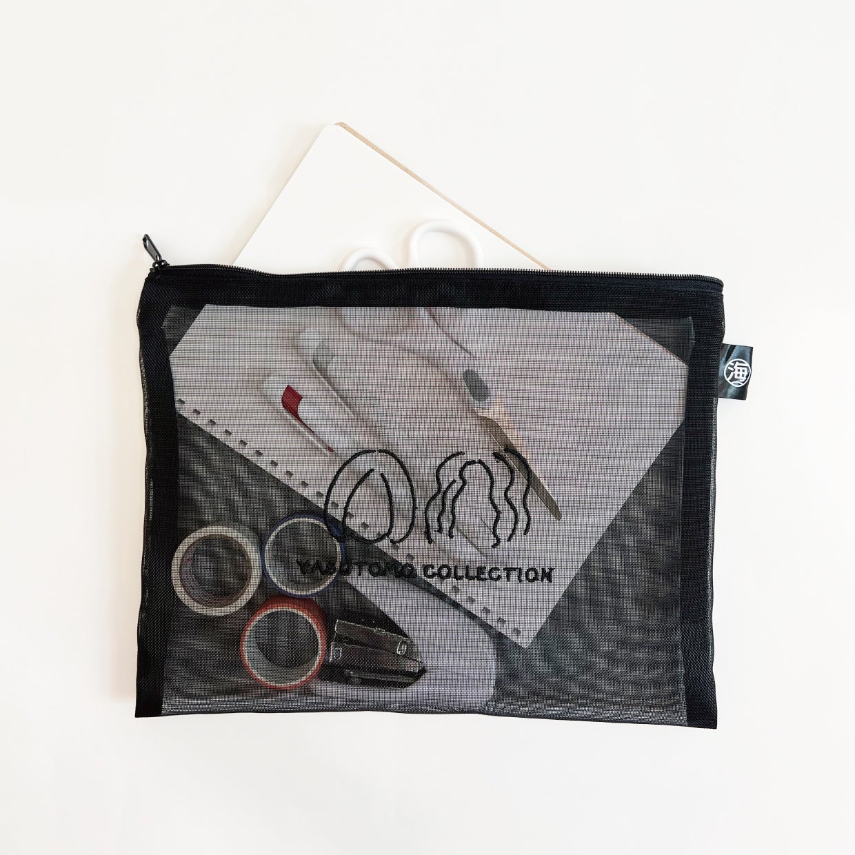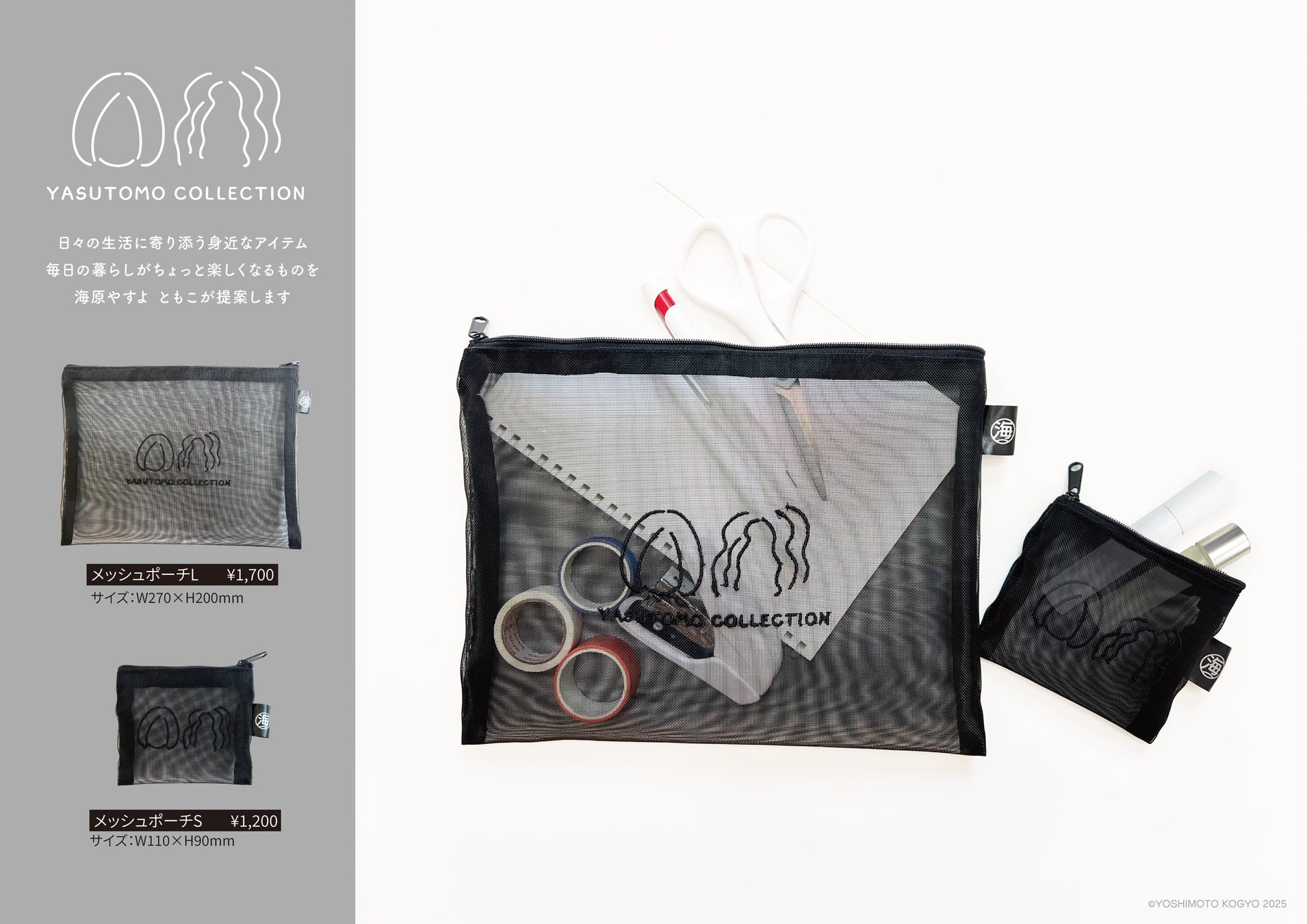YASUTOMO COLLECTIONのロゴが刺繍された、メッシュ素材のポーチ。