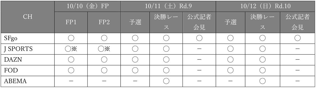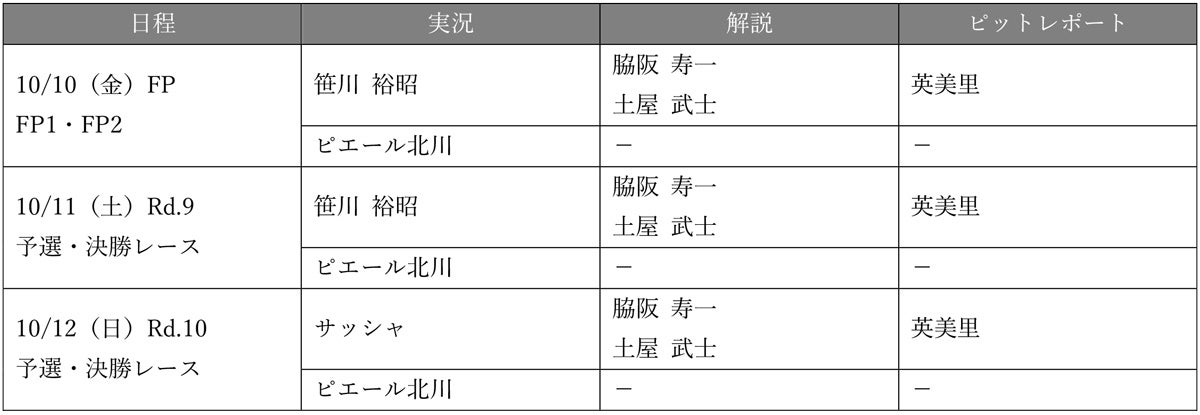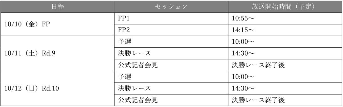 国内最⾼峰で最速の⾃動⾞レースシリーズである全⽇本スーパーフォーミュラ選⼿権(以下、SUPER FORMULA)を運営する株式会社⽇本レースプロモーション(以下、JRP)は、10⽉10⽇(⾦)・11⽇(⼟)・12⽇(⽇)の3⽇間、富⼠スピードウェイ(静岡県⼩⼭町)で開催されるSUPER FORMULA 第9戦・第10戦富⼠⼤会の放送スケジュールおよび公式放送の出演者を発表しました。