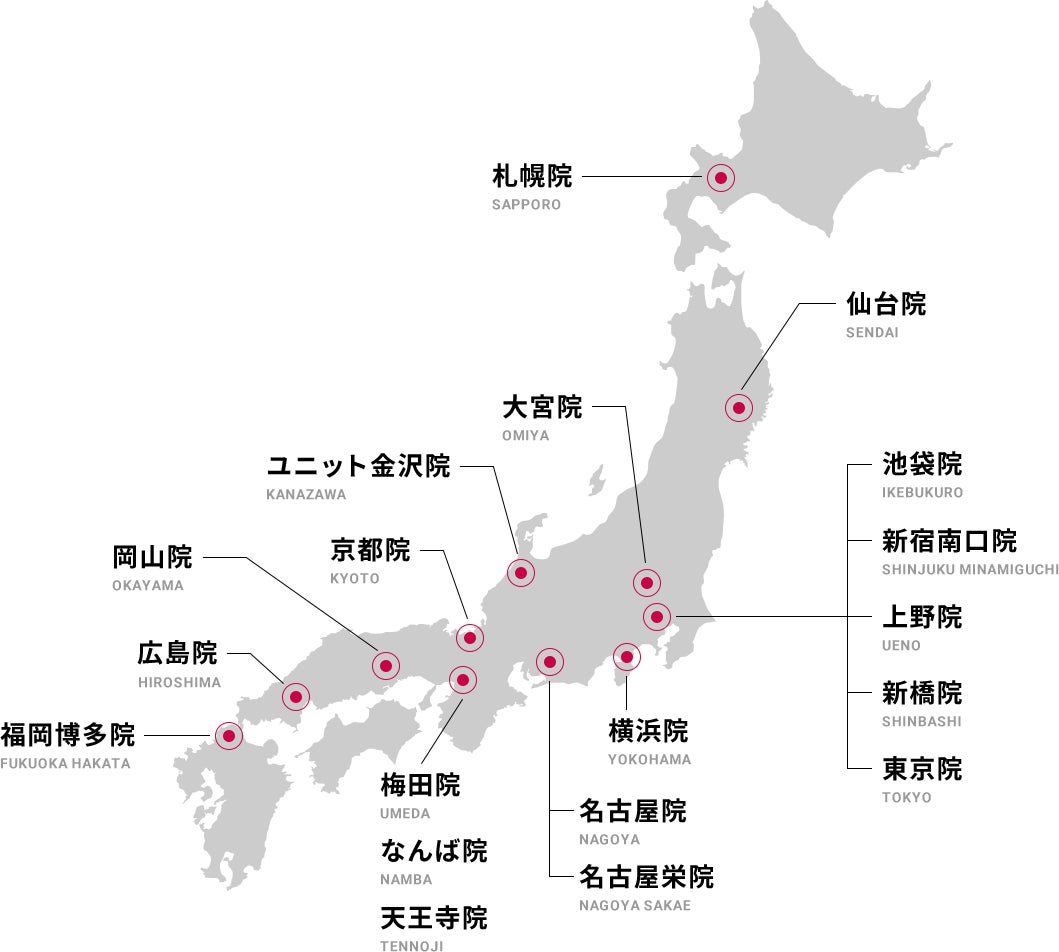 当グループは提携院を含め、北海道(札幌)、東北(宮城・仙台)、関東(東京、埼玉、神奈川)、北陸(金沢)、中部(名古屋、栄)、関西(大阪、京都)、中国(広島、岡山)、九州(福岡・博多)と全国に19院展開しております。