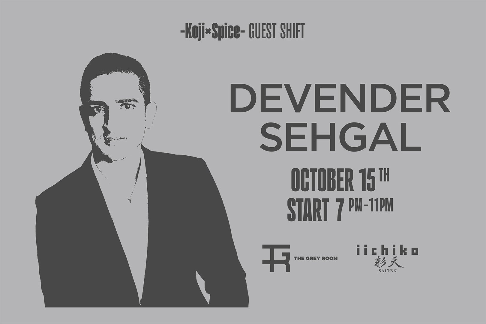 舞台となるのは、銀座の名所・数寄屋橋交差点を見下ろすことができる地上30mのビル最上階のバー「THE GREY ROOM」。銀座の喧騒から離れた非日常的空間で、日本伝統の麹の「うまみ」を最大限に表現した本格麦焼酎「iichiko彩天」を使用して、デヴェンダー氏のインドのスパイス感覚、香港のダイナミズム、日本の繊細さを融合させた多文化的アプローチのカクテル4種がお楽しみいただける、THE GREY ROOMならではのゲストバーテンダーイベントとなっています。