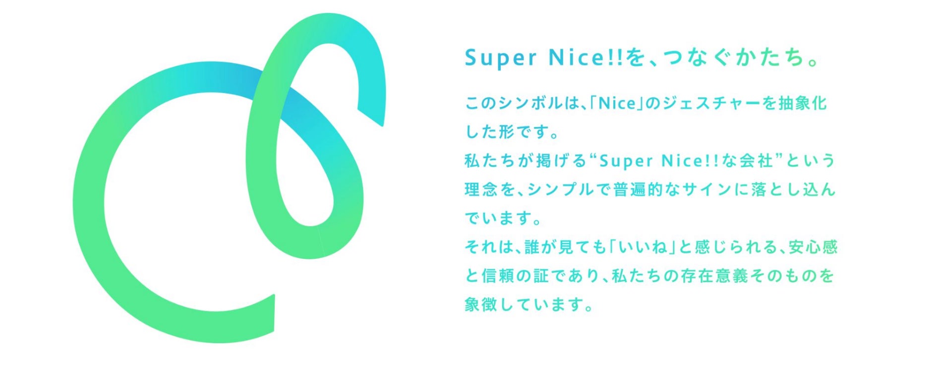 「Super Nice!!」は、創業当初から仲間同士が自然に口にし合い、互いを思いやり、誰かの力になる姿を映してきた言葉です。当社ではいわゆるMVVを「We are Super Nice!!」と題して、経営理念や行動指針を示しておりました。新しいロゴ策定においても、「We are Super Nice!!」という理念が大きな軸となっていますので、今回あらためて対外的にも公表することといたしました。