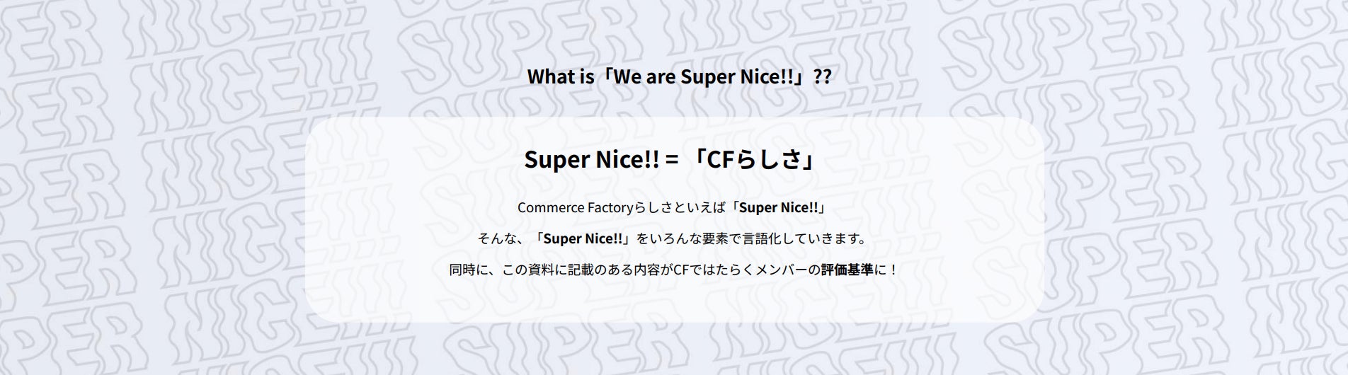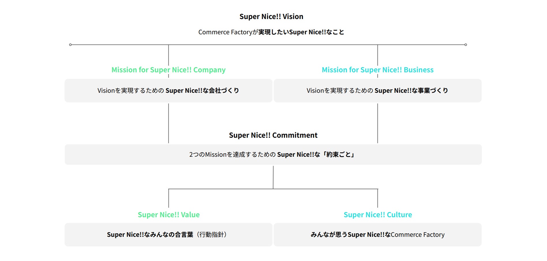 『We are Super Nice!!』では、コマースファクトリーとして実現したいことをVisionとして掲げて、Visionを実現するための要素として「会社づくり」「事業づくり」の2つのMissionを策定しております。各Missionには、Commitmentという「約束ごと」を策定し、Missionを支える要素として「Value」と「Culture」を策定しました。