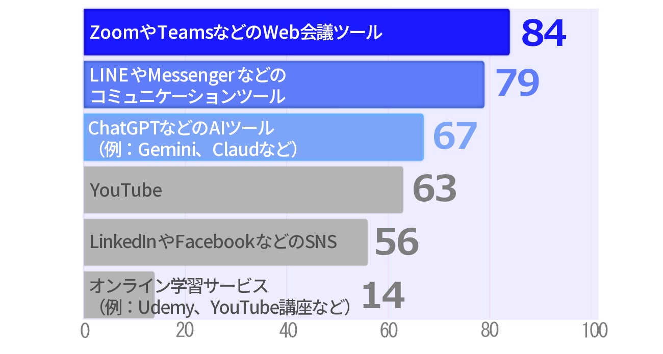 日常に利用する会議ツールやコミュニケーションツールは多くの方が使いこなしているようです。また、特徴的だったのは「何らかのAIツール(例:ChatGPT)を日常業務に取り入れている」と回答した層が目立ったことです。業務効率化だけでなく、企画書作成や情報収集にも活用しており、シニア人材が新しい技術に対して柔軟である実態が明らかになりました。