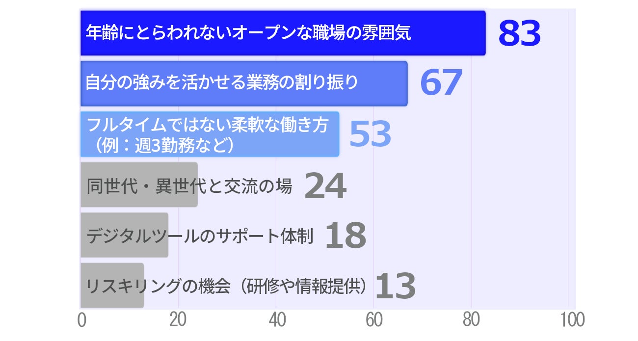 「業務内容の明確化」「柔軟な働き方(時間・場所)」「心理的安全性」「最新情報の共有機会」などが上位に。能力を活かすには環境づくりが不可欠であり、企業とシニア人材の“情報格差の解消”が重要なテーマであると考えられます。