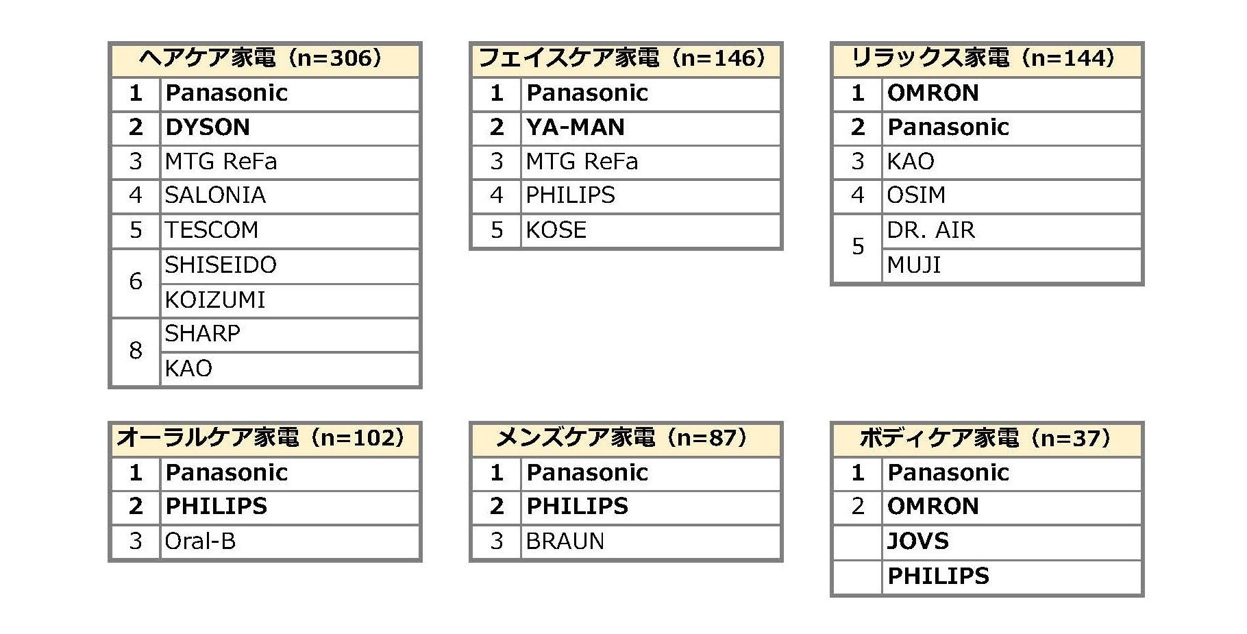 日本で「ヘアケア家電」「フェイスケア家電」「リラックス家電」「オーラルケア家電」「メンズケア家電」「ボディケア家電」それぞれを買いたいと答えた人にブランド名を聞きました。自由回答形式で聞き集計したところ、パナソニックが全6カテゴリーのうち「ヘアケア家電」「フェイスケア家電」「オーラルケア家電」「メンズケア家電」「ボディケア家電」の5つで1位でした。残る「リラックス家電」の1位はオムロンでした。