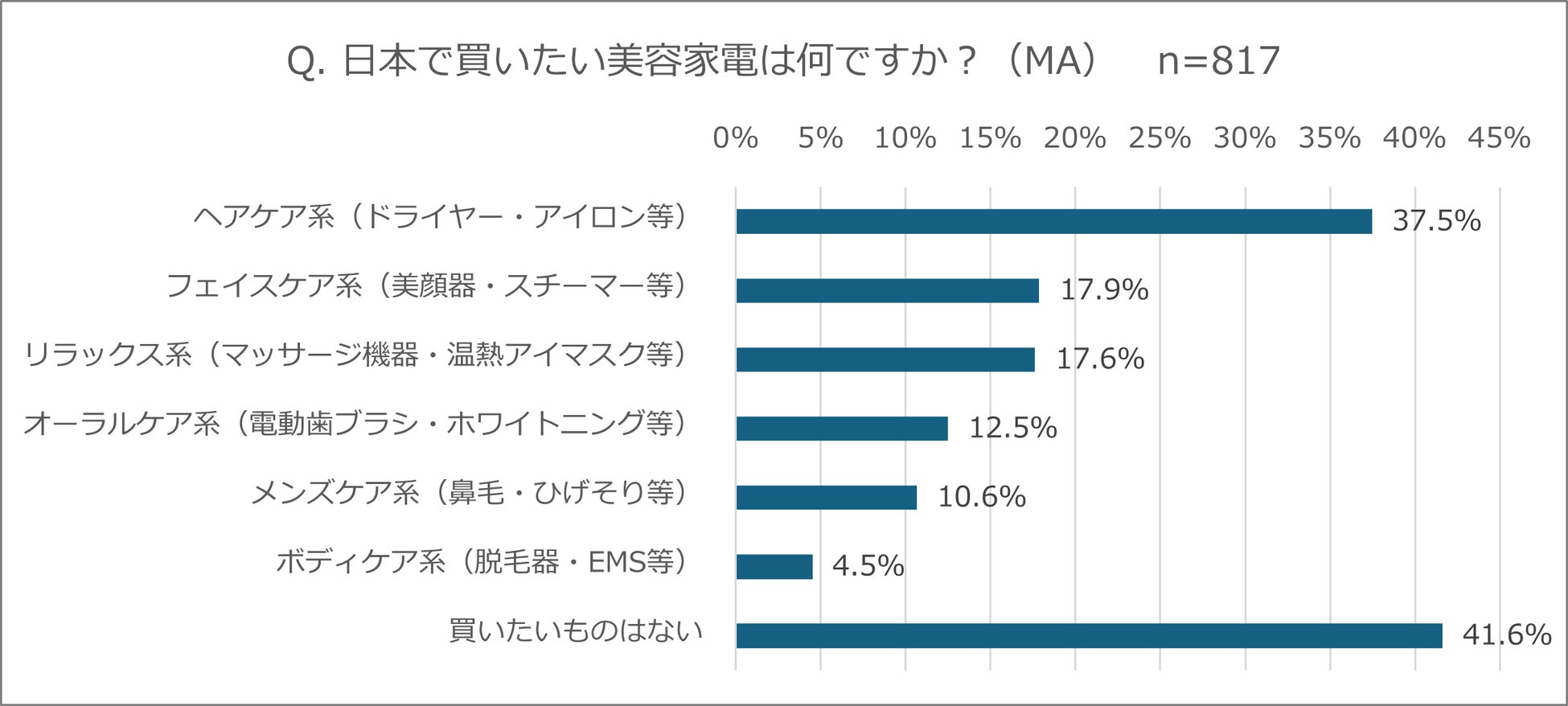 回答者全員に、日本で買いたい美容家電について聞きました。複数回答形式で質問したところ、1位は「ヘアケア家電」で37.5%でした。2位は「フェイスケア家電」(17.9%)、3位はマッサージ機器などの「リラックス家電」(17.6%)でした。また、「買いたいものはない」との回答が41.6%だったことから、全体の半数以上となる58.4%が「日本で美容家電を買いたい」ことが示されました。
