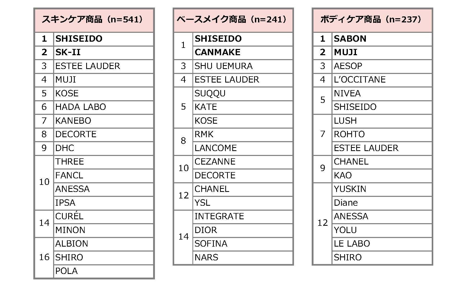 ・無印良品が「スキンケア商品」で4位、「ボディケア商品」は2位、「フレグランス商品」で4位、「ヘアケア商品」で他4ブランドとの同率4位。