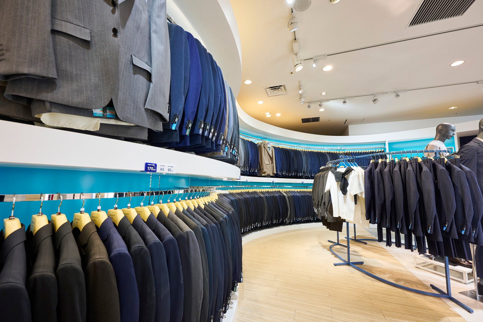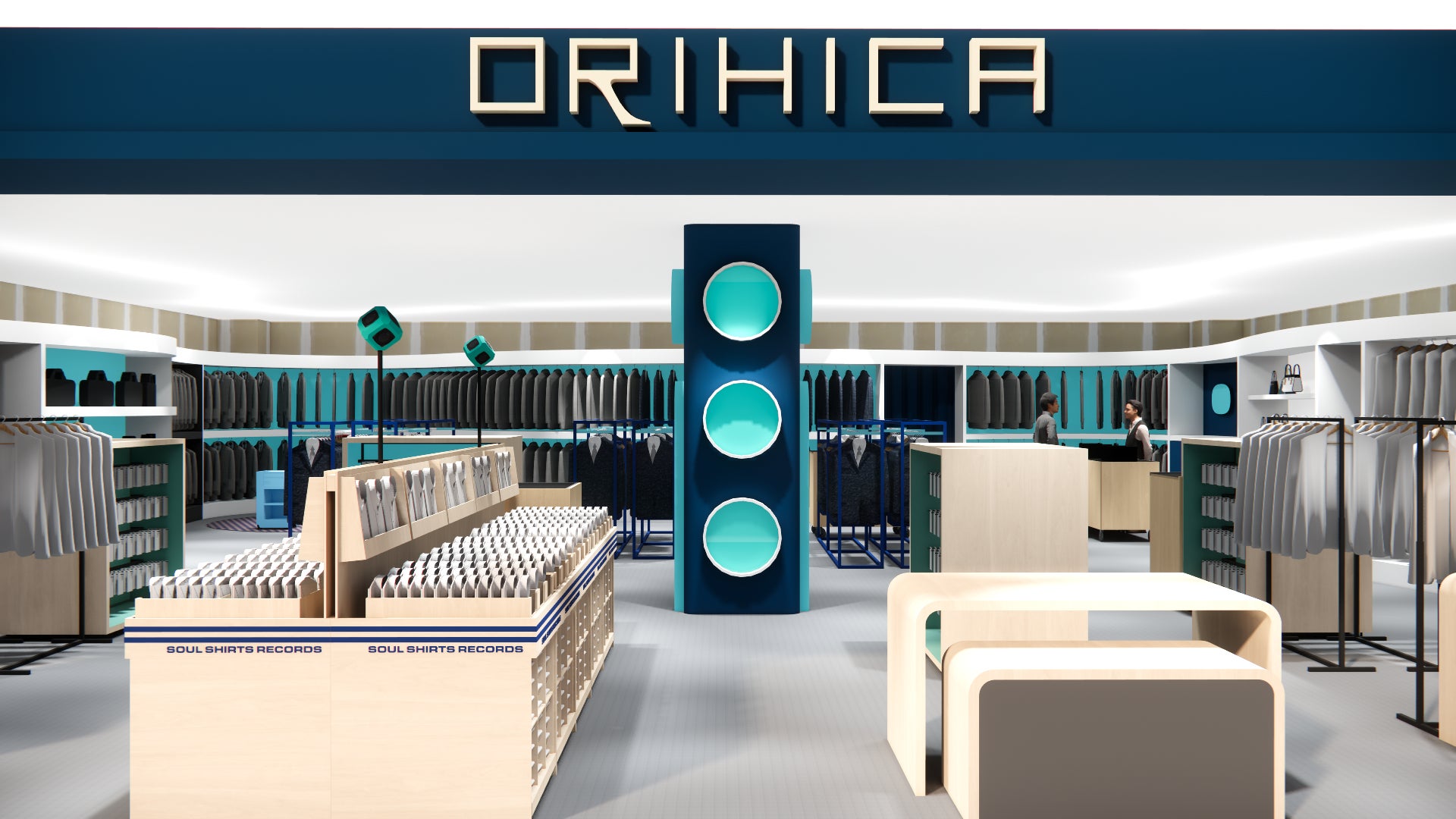 本店舗の内装は「レトロフューチャー」をコンセプトに、懐かしさと新しさが融合した空間といたしました。近年リニューアルオープンした 「ORIHICA 東京ドームシティラクーア店」「ORIHICA 二子玉川ライズ・ショッピングセンター店」「ORIHICA 流山おおたかの森S・C店」においても同様の内装を施しており、お客様からも大変ご好評いただいております。やわらかな曲線デザインとブランドを象徴する「オリヒカブルー」を基調とした新しいカラースキームを採用し、店内中央のスピーカーから流れる音楽が、ショッピングのひとときをより楽しく演出します。