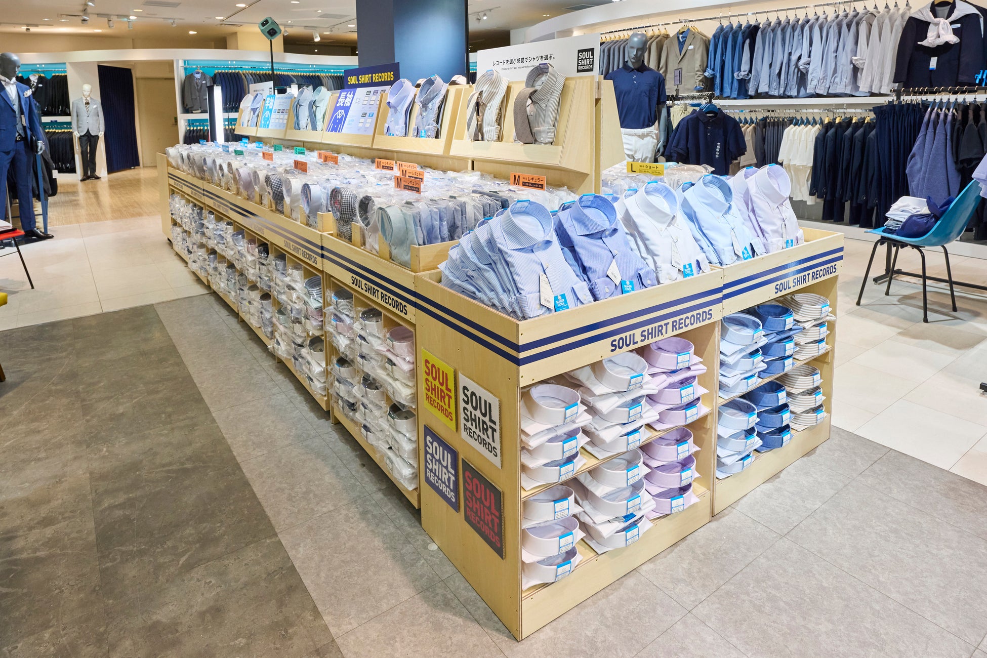 ワイシャツコーナーでは、レコードショップのように縦置きに並んだシャツを、心地良い音楽を聴きながらレコードを選ぶような感覚で商品を手に取ってご覧いただくという、ORIHICA実店舗ならではのアナログ体験をお楽しみいただけます。シーズンごとに選曲されたプレイリストが、什器中央に設置されたキューブスピーカーから店内へと広がります。