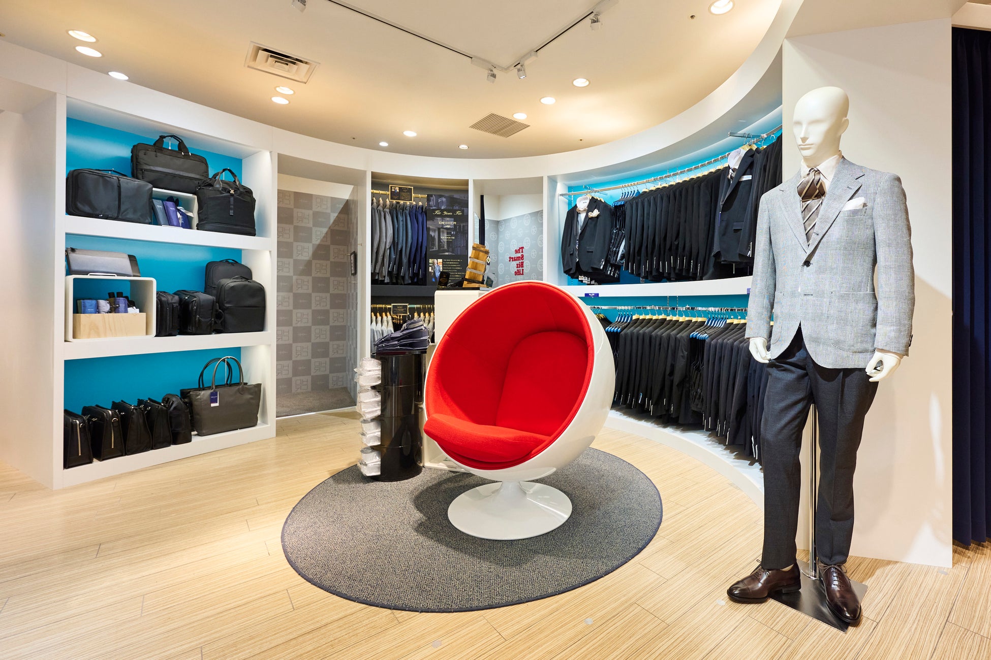 ミッドセンチュリーを代表するボールチェアを配し、包み込まれるような心地良さの中でゆったりとお過ごしいただけます。ご試着の合間やお連れ様の待合時間にも、くつろぎを感じられる空間です。