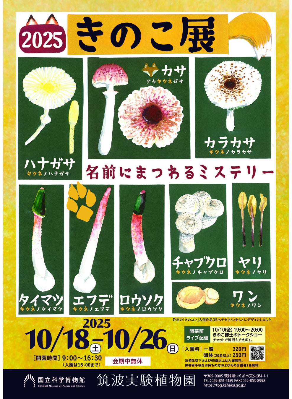 企画展「きのこ展 ~名前にまつわるミステリー~」:https://tbg.kahaku.go.jp/event/2025/10kinoko/