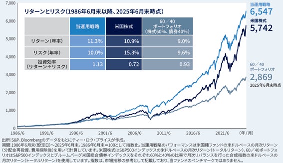 [5] 出所:S&P、Bloombergのデータをもとにティー・ロウ・プライスが作成。期間:1986年6月末(設定日)~2025年6月末。当運用戦略のパフォーマンスは米国籍ファンドの米ドルベースの月次リターン(分配金再投資、費用控除後)を用いて計算しています。