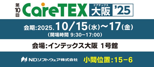 エヌ・デーソフトウェア株式会社(本社:山形県南陽市、代表取締役社長:松山 庸哉、以下「NDソフトウェア」)は、2025年10月15日(水)から17日(金)までインテックス大阪で開催される「第10回 CareTEX大阪’25」に出展することをお知らせいたします。