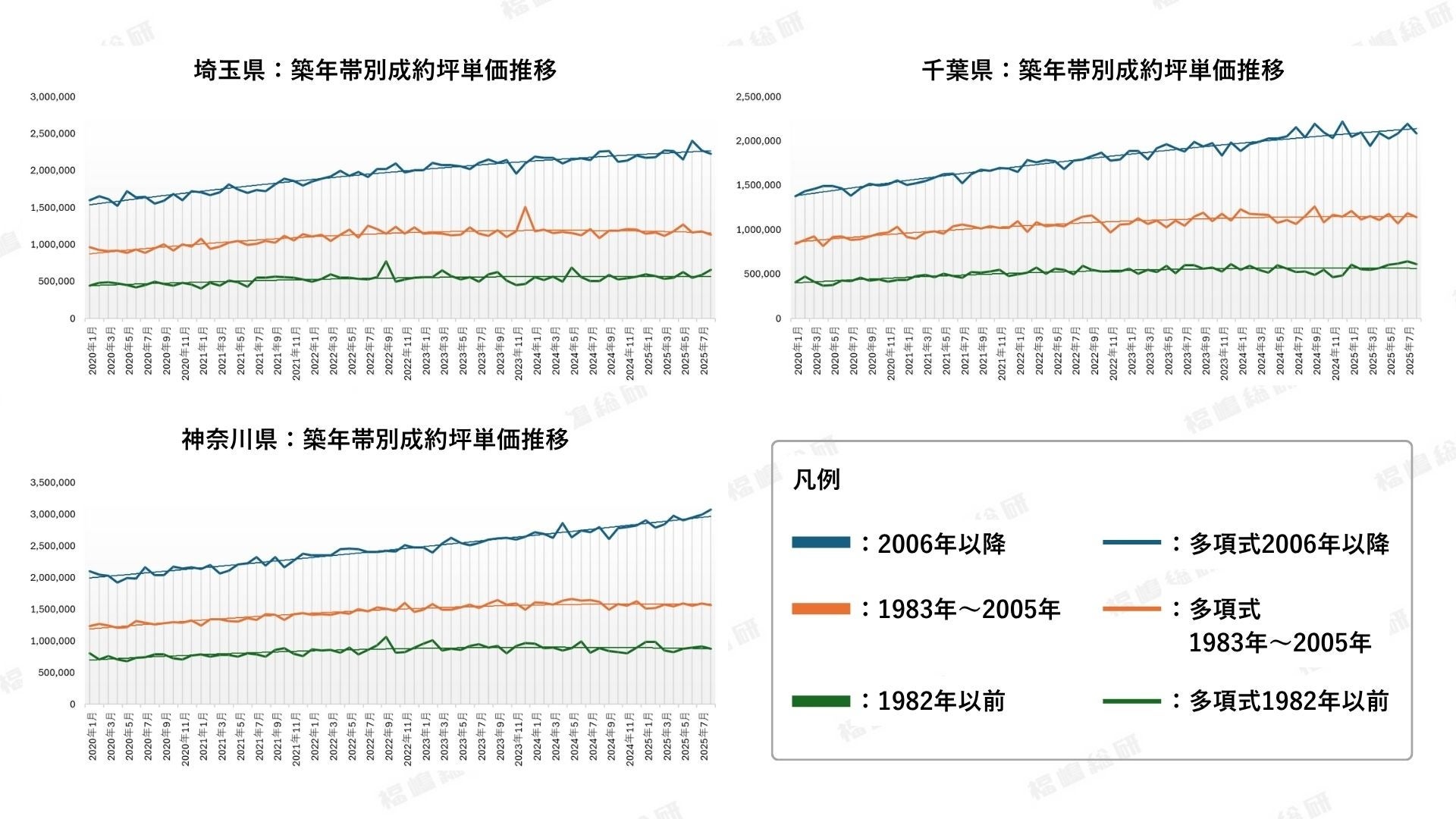 この視点から整理すると、神奈川・千葉・埼玉における坪単価の「やや減少」は、実際の物件価値が下落したのではなく、築古物件の比重が増加した結果にすぎないと理解できます。むしろ個別の築年帯でみれば、坪単価は横ばいまたは上昇を維持しており、市場が下向きに転じているとは言えません。