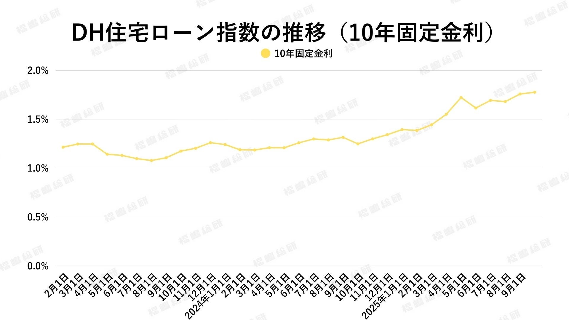 10年固定金利は上昇傾向にあり、DH住宅ローン指数は1.776%で前月の1.758%から小幅上昇、前年の1.248%と比べると大幅に上昇しています。日本国債10年利回りは先月1.559%から今月1.614%に上昇しており、金利全体の上昇局面が継続しています。