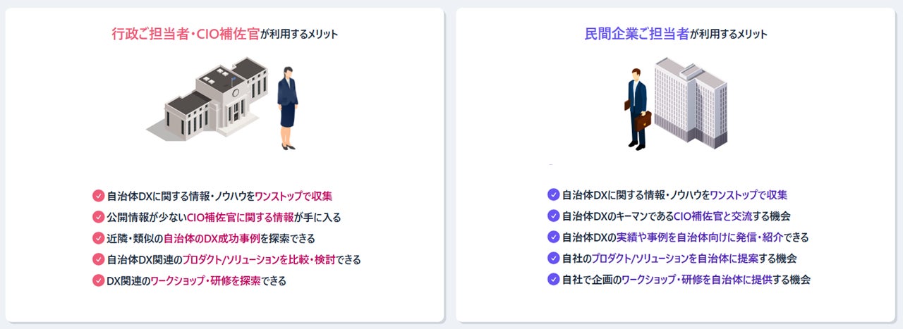 行政職員やCIO補佐官が登録可能で、行政DXにおける課題解決のヒントを得られます。民間企業が提供するプロダクトやソリューションや研修、導入事例を検索・閲覧しDXのポイントを学べるだけでなく、関心のある企業へ直接問い合わせできます。