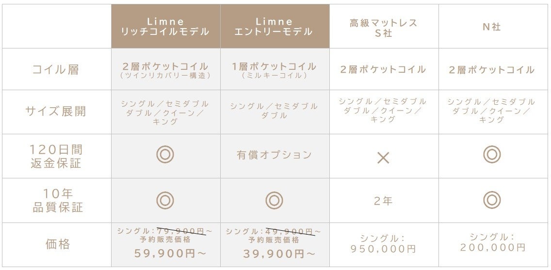 株式会社LIMNE(リムネ)(本社:東京都渋谷区、代表:合谷賢幸)は、 100万円を超える高級マットレスに多く採用されている「二層ポケットコイル構造」を採用した新シリーズ「Limneリッチコイルモデル」と、新感覚な寝心地をもっと身近に感じていただける「Limneエントリーモデル」を発売いたします。