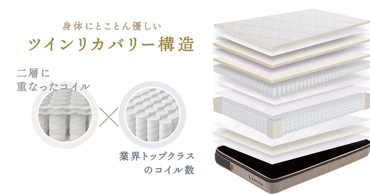100万円クラスの高級マットレスと同等の構造を、Limne独自の設計で再現する為、ツインリカバリー構造(二層ポケットコイル)を採用。