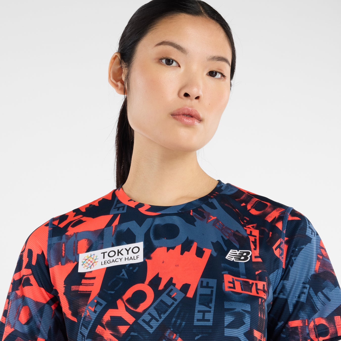 軽量で優れた吸汗速乾性と通気性を発揮するNB Dry搭載のボーダーメッシュ素材を使用。前後差のある着丈で、サイドのスリットが空気の流れをつくり、通気性を向上。東京の街をモチーフにしたオールオーバーグラフィックプリントと、右胸の東京レガシーハーフの大会ロゴがアクセント。左胸のNBフライングロゴは柄の中でも視認できるマットプリントで演出しています。