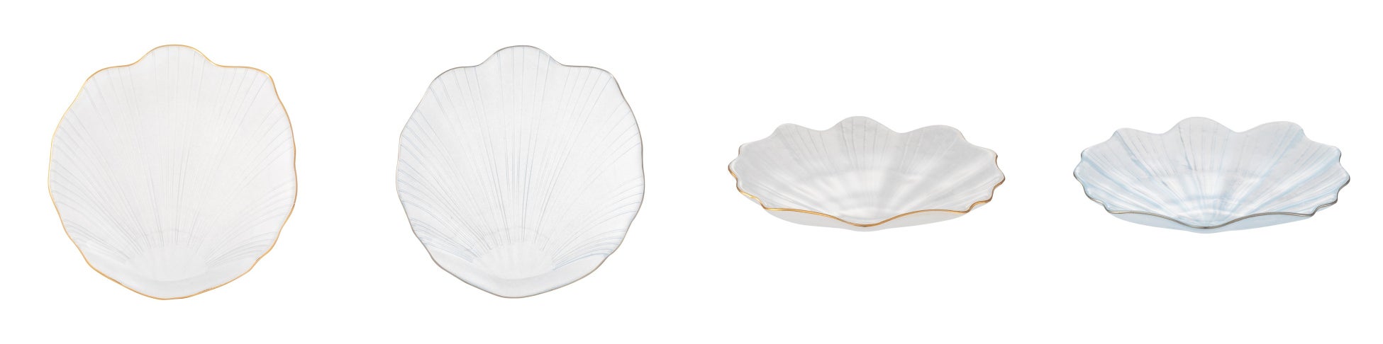 貝の凸凹などを細かく取り入れたデザインのプレートです。Sサイズはケーキを乗せるのにぴったりな形状でカフェタイムに、Mサイズは副菜や一人前のパスタなどに使いやすく、ディナータイムに活躍します。