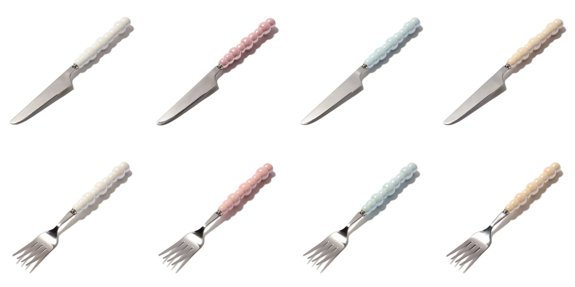 持ち手がセラミック素材のカトラリーです。ボウルやプレートと合わせて、パールで統一感のあるテーブルコーディネートが楽しめます。