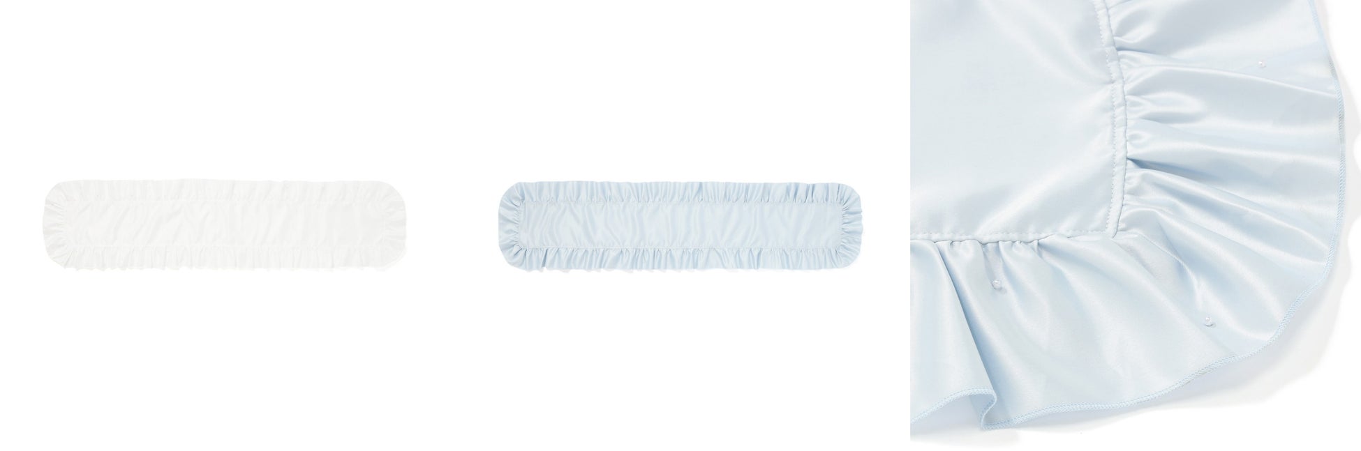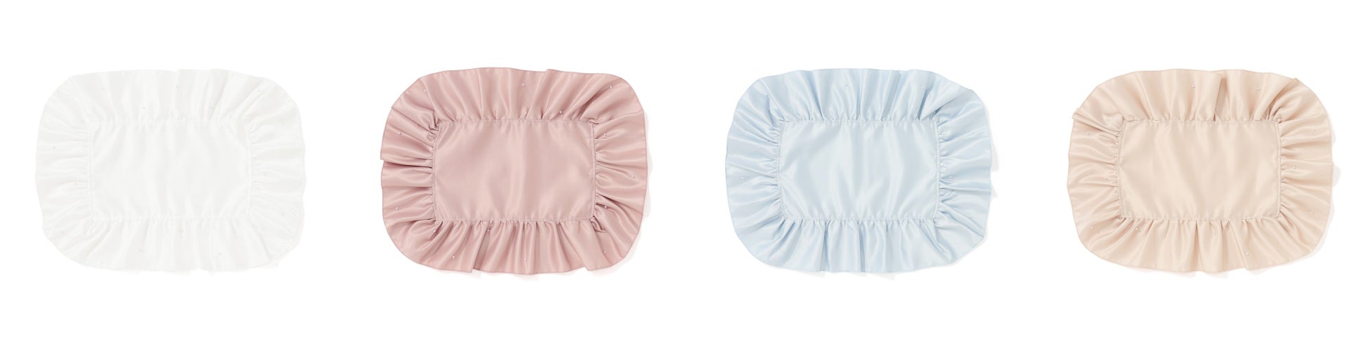 広めのフリルがポイントのランチマットとテーブルランナーです。光沢感のある生地に、小ぶりなパールを付けて装飾性のあるデザインに仕上げました。食卓をより華やかに演出してくれます。