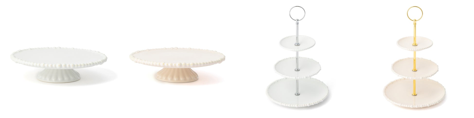 パールをリムにあしらったデザインのケーキスタンドです。1段はお菓子やケーキ、パンをのせて日常使いにはもちろん、3段は本格的なアフタヌーンティー気分を楽しめて、おもてなしにも活躍します。